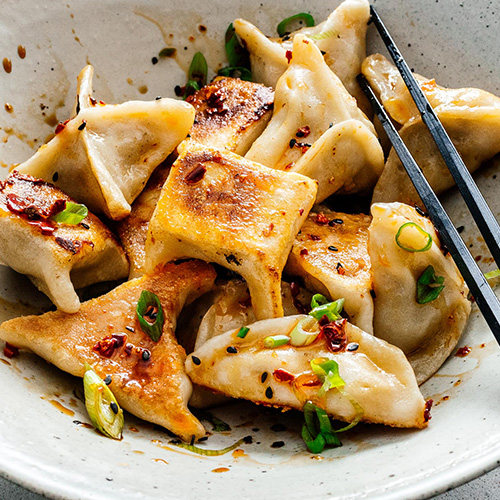 Jiaozi are half-moon-shaped dumplings filled with meat and spices. They vary depending on where you get them from, but they can include blueberries, carrots, or leeks inside. The best-known place for these delicious snacks is China's northern provinces. When eating them, they must be dipped in a soy sauce with vinegar and fried garlic.