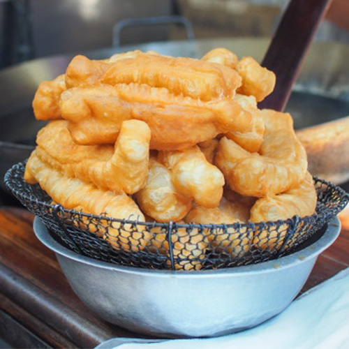 Youtiao or youtiao, as they are called in Singapore and other Southeast Asian countries, is a long fried dough stick eaten during breakfast time by being dipped in soy milk or congee. These breadsticks can also be accompanied by different kinds of dumplings such as shengjian mantou, xiaolongbao, baozi, or jiaozi.