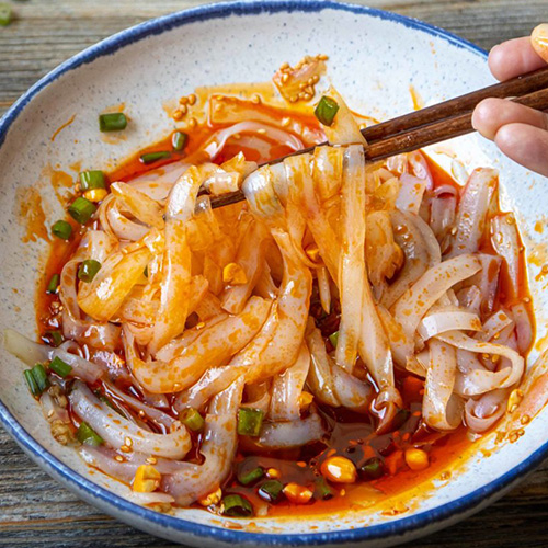 This dish of cold noodles is one of China's most popular summer dishes due to its refreshing characteristics. It includes mainly mung bean jelly, but you can also see it mixed with meat or other kinds of vegetables, depending on where you choose to eat it.